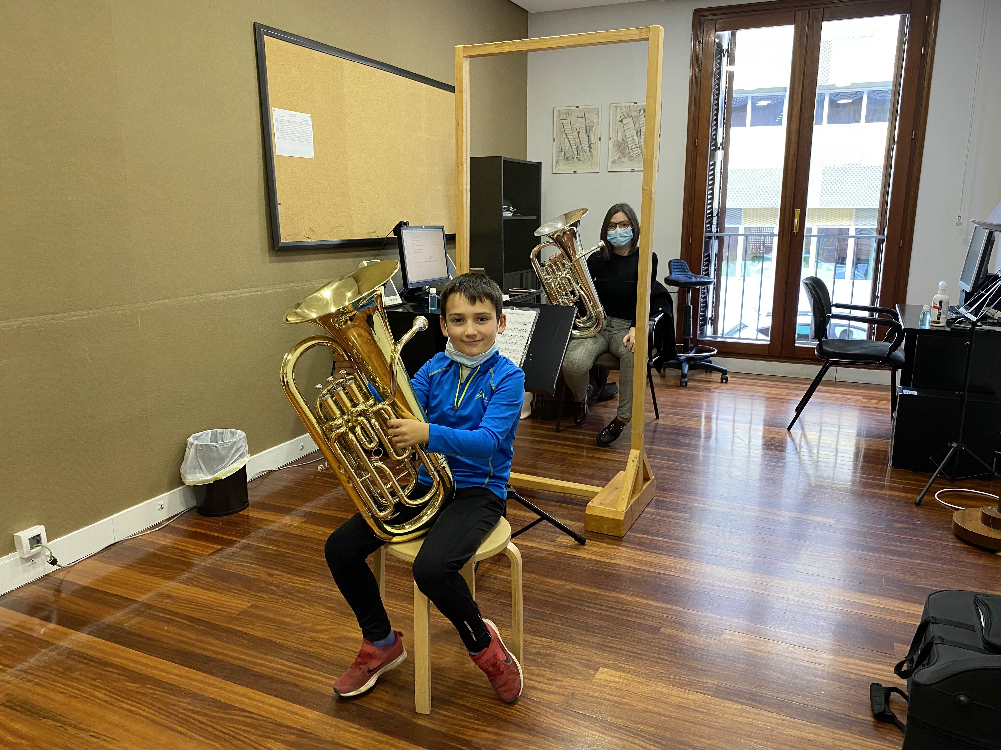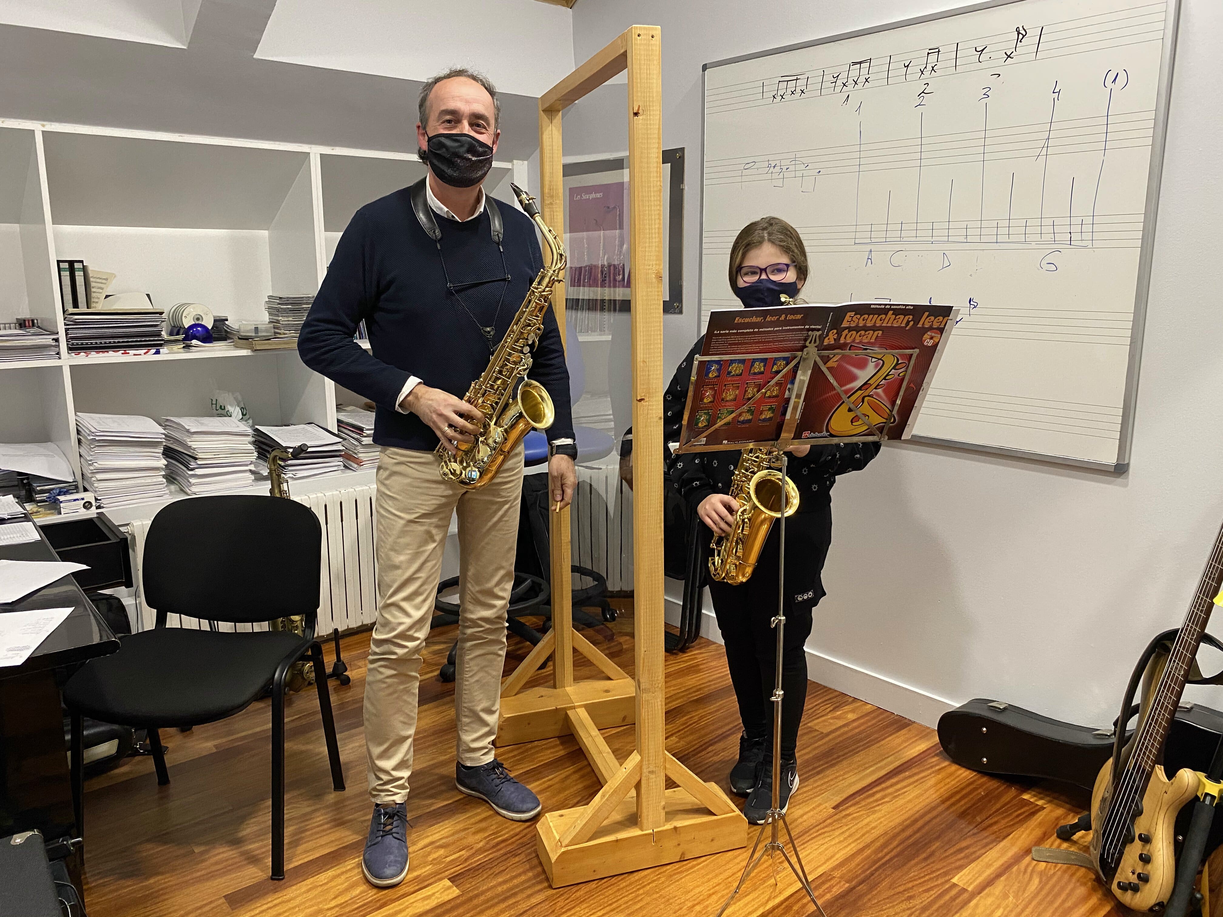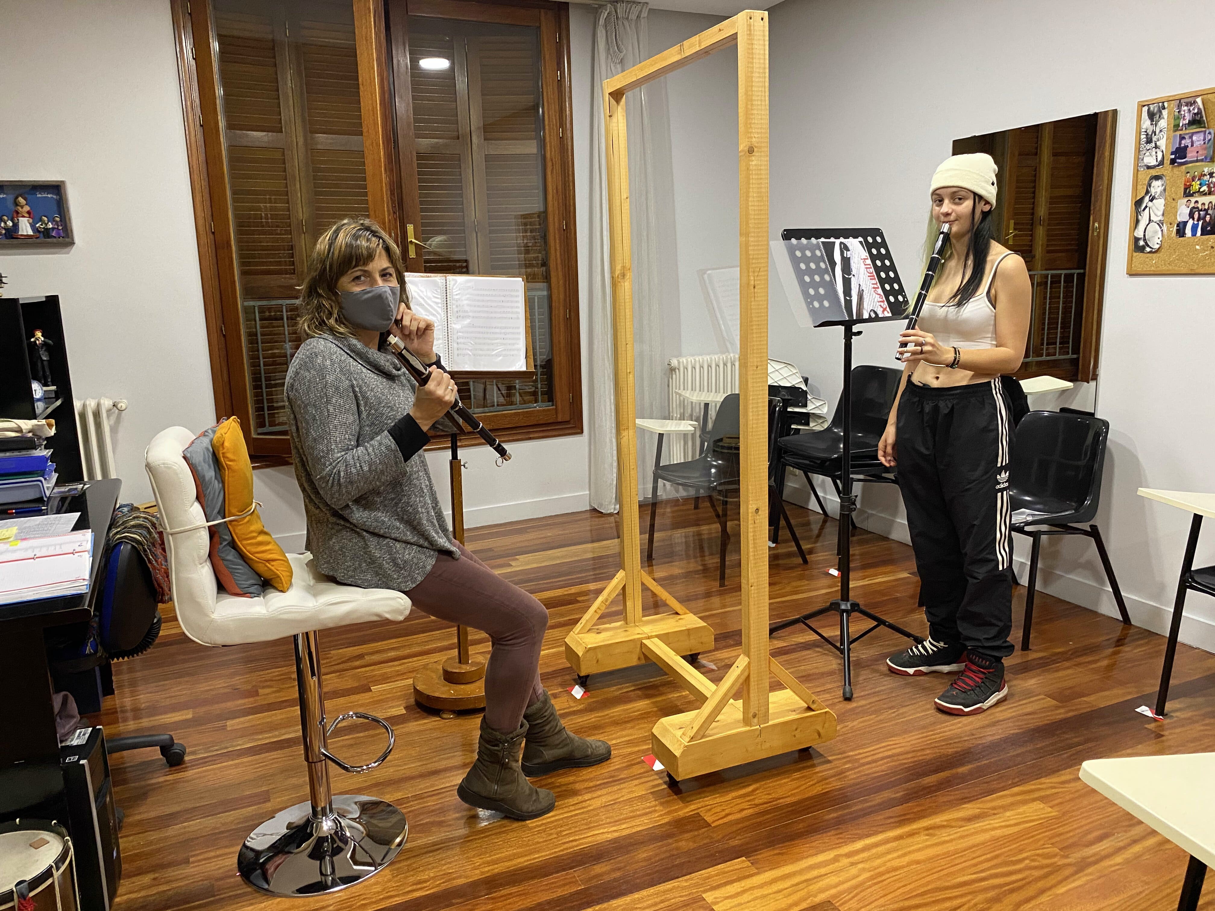 Pero toda situación tiene su parte positiva, y es el aprendizaje que supone enfrentarse a ella y aprender nuevos recursos. Es la comprensión por parte de todos/as y el esfuerzo de adaptarse para seguir adelante. La implicación para que todo funcione, como por ejemplo el caso de Ibai y Javier, que fueron quienes durante mañanas de un trabajo totalmente ajeno al suyo, construyeron desde cero las mamparas protectoras que se utilizan en las clases de instrumentos de viento, canto, agrupaciones; o de las familias, haciendo malabares con los calendarios de rotación de las clases de lenguaje musical; en fin, de todos/as los/as que formamos parte de esta escuela.
