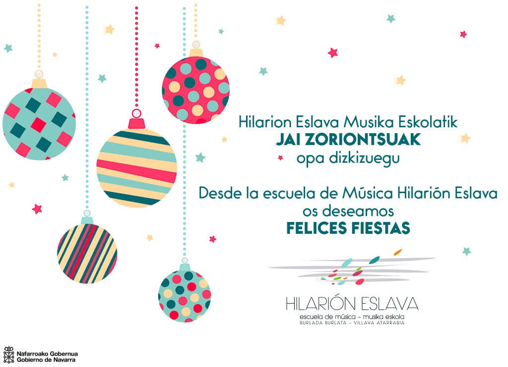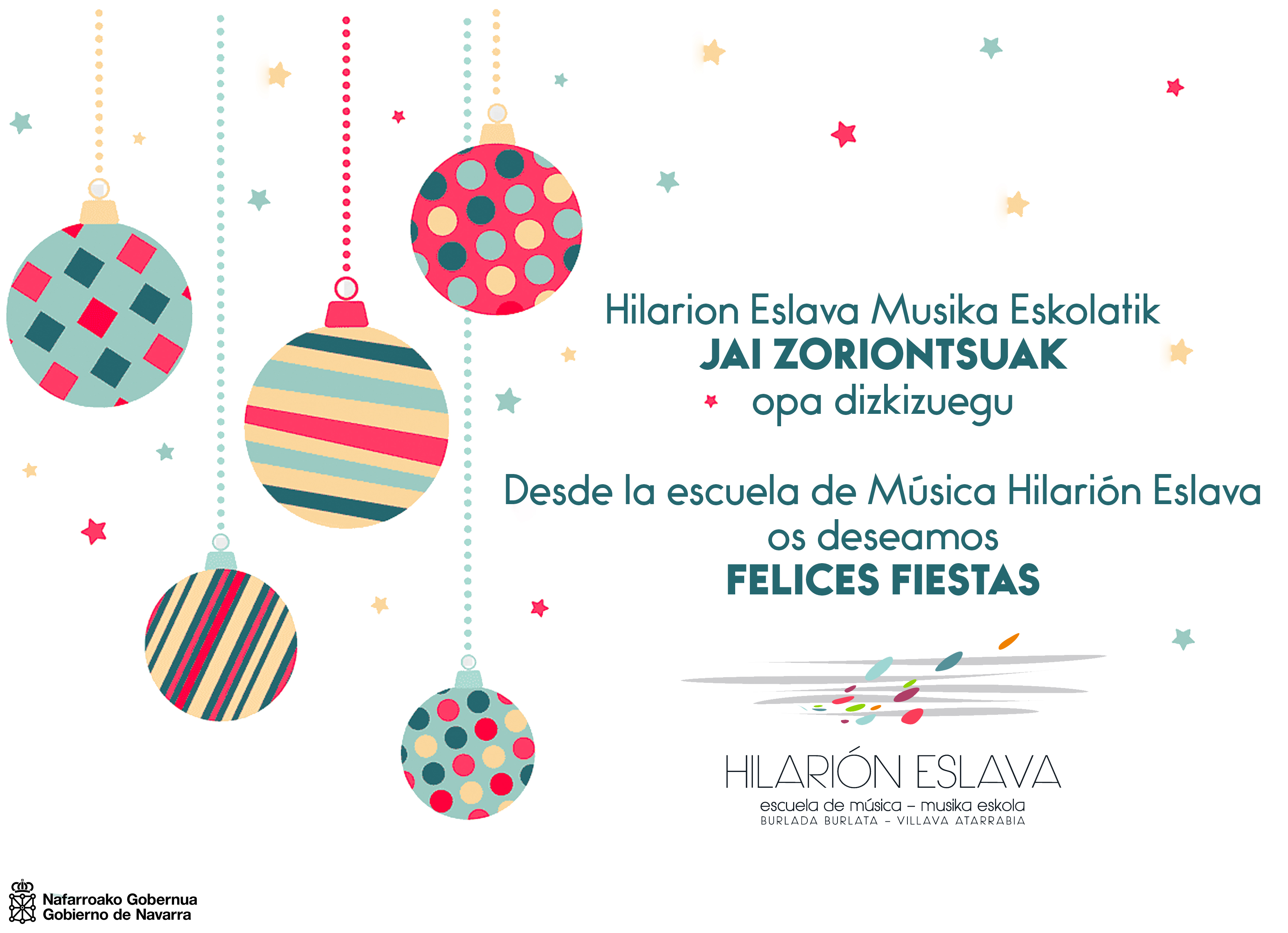 Desde la Escuela de Música Hilarión Eslava de Burlada/Villava, os deseamos todo lo mejor para estos días y para el año que entra, como siempre decimos, salud (ahora más que nunca), amor y MÚSICA!